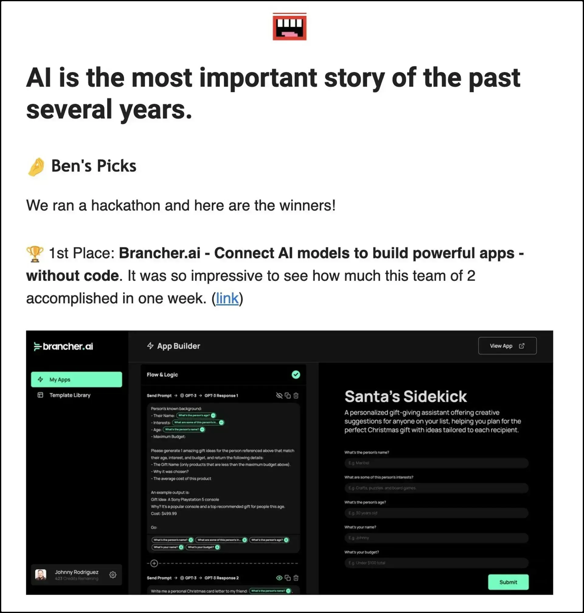 My co-creator Johnny Rodriguez and I decided to join a week-long hackathon hosted by Ben’s Bites, one of the fastest growing newsletter on the topic of AI. Leveraging the power of GPT-3 and DALL-E, we set out to create a platform that allows non-engineers to build and deploy AI tools in matter of minutes. At the end of the hackathon, we were pleased to win the 1st place! We are continuing to invest our time in making the app more powerful and accessible for everyone.